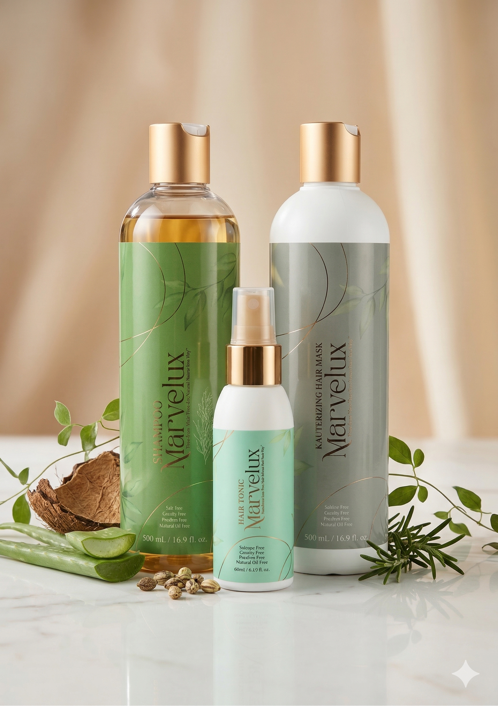 ✨ Kit Anticaída y Crecimiento Marvelux (Shampoo + Tónico + Mascarilla 3D)